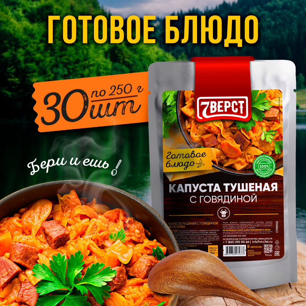 Купить 7 вёрст Говядина с тушеной капустой. Готовая еда в реторт-пакете. Консерва в фольге Набор 30 уп. по 250 г