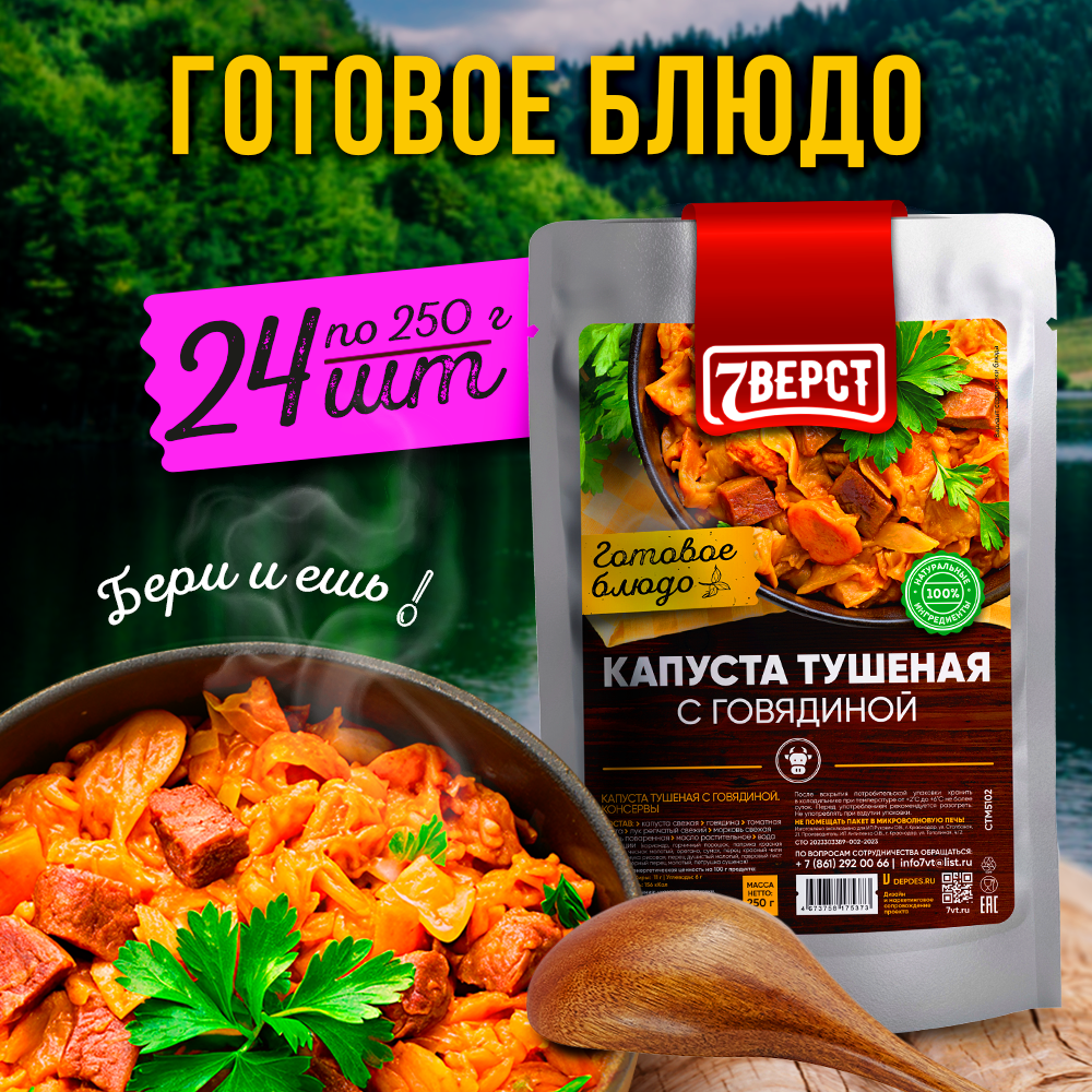 Сохранить7 вёрст Говядина с тушеной капустой. Готовая еда в реторт-пакете. Консерва в фольге Набор 24 уп. по 250 г интересное: