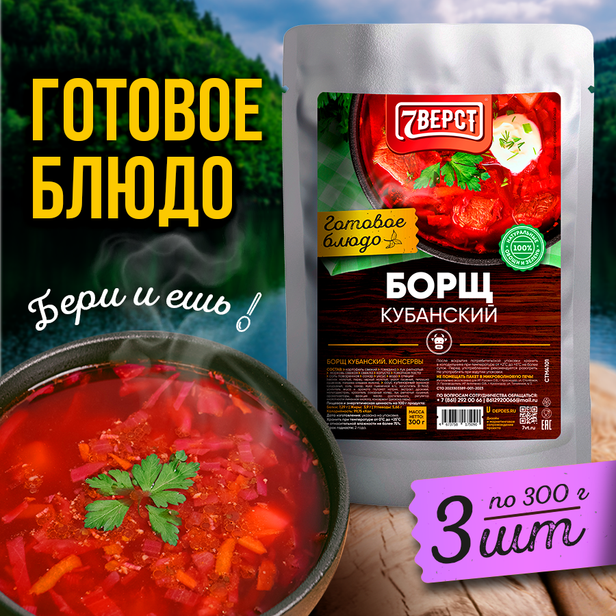 Купить 7 вёрст Борщ с говядиной. Готовое консервированное блюдо в реторт-пакете. Консерва в фольге Набор 3 уп. по 300 г