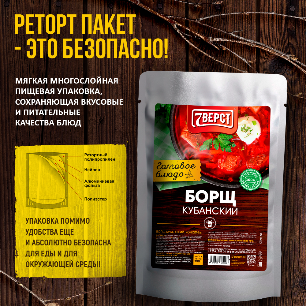 7 вёрст Борщ с говядиной. Готовая еда в реторт-пакете. Консервы натуральные. 1 уп. 300 г