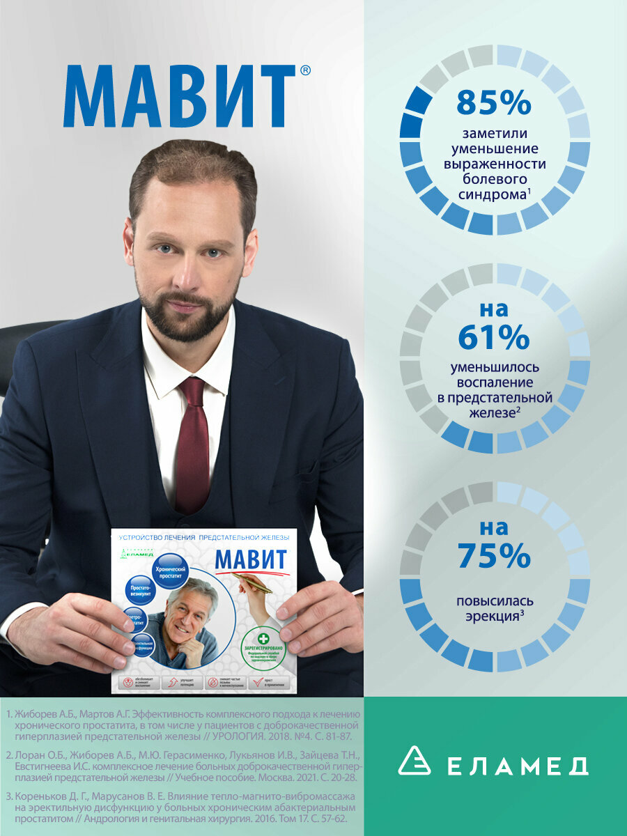 ИЗ ОПЫТА ИСПОЛЬЗОВАНИЯ : после одного - двух сеансов всегда случалось обострение(весь набор симптомов которых до сеанса не было) ,а ОБОСТРЕНИЕ это уже противопоказания. через 8 лет ежегодных безуспешных попыток провести хотя бы половину курса (одного хотя бы) унёс приблуду в гараж на бессрочное хранение. в заключение имею аденому с предельным ПСА и простатит хр. Имею двух знакомых , пользующихся МАВИТОМ не менее длительно . один носит 3 месяца катеттер и неоперабельный рак простаты. второй пока жив после операции рака простаты. ВЫВОДЫ ДЕЛАТЬ ВАМ !! |