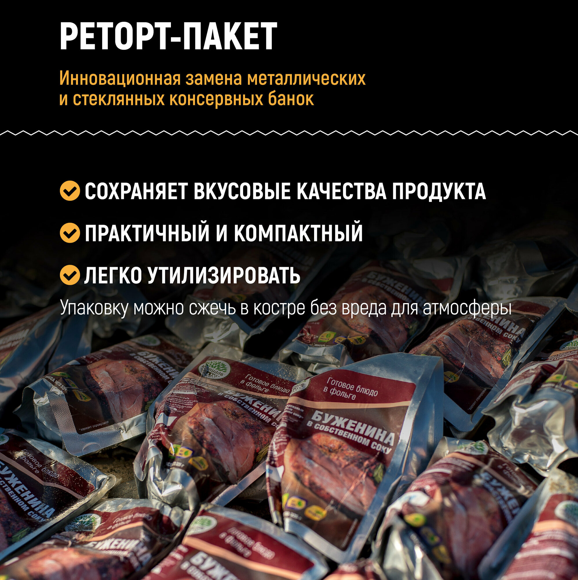 Готовое мясное натуральное блюдо в реторт-пакете "Буженина в собственном соку" Кронидов Сухой паек для охоты, рыбалки, в поход Набор 4 шт. по 325 гр.