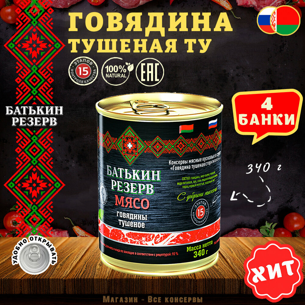 Купить Говядина тушеная, Батькин резерв, ТУ, Белорусская, 4 шт. по 340 г