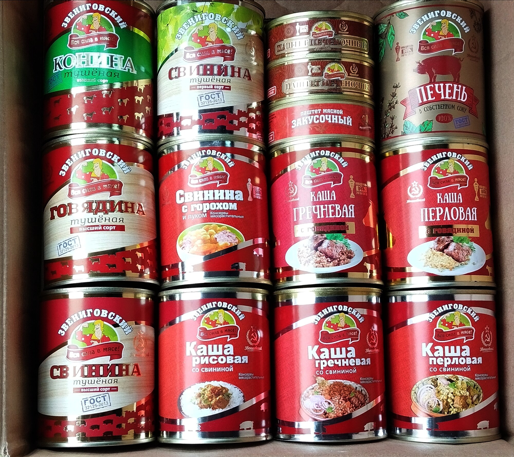 | Состав | 1.Свинина тушеная высший сорт ГОСТ, 338 г. - 1 шт. 2.Свинина тушеная первый сорт ГОСТ, 338 г. - 1 шт. 3.Говядина тушеная высший сорт ГОСТ, 338 г. - 1шт. 4.Конина тушеная высший сорт ГОСТ, 338 г. - 1шт. 5.Свинина с горохом и луком ГОСТ, 340 г. - 1шт. 6.Каша рисовая со свининой ГОСТ, 340 г. - 1шт. 7.Каша перловая с говядиной ГОСТ, 340 г. - 1шт. 8.Каша перловая со свининой ГОСТ, 340 г. - 1шт. 9.Каша гречневая с говядиной ГОСТ, 340 г. - 1шт. 10.Каша гречневая со свининой ГОСТ, 340 г. - 1шт. 11.Печень свиная в собственном соку ГОСТ, 340 г. - 1шт. 12.Паштет закусочный мясной, 100 г. - 1шт. 13.Паштет печеночный особый 100г. - 2шт. |