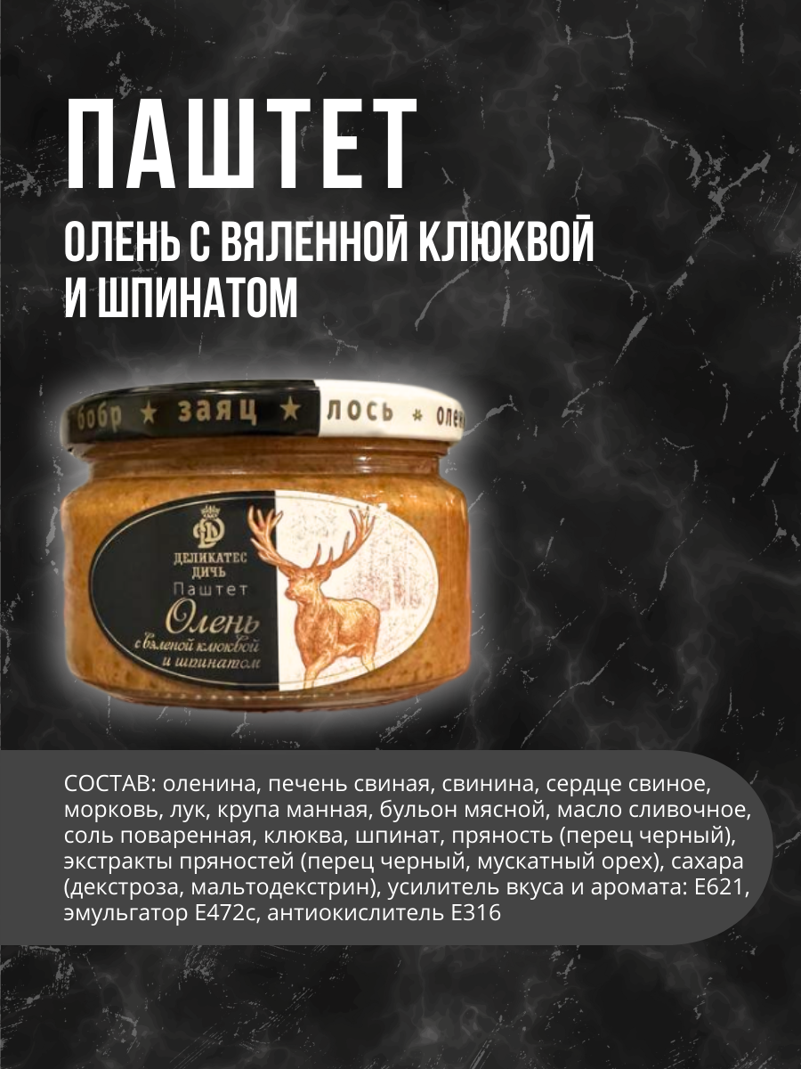 Паштет из мяса Оленя с вяленой клюквой и шпинатом 200 грамм стекло интересное: