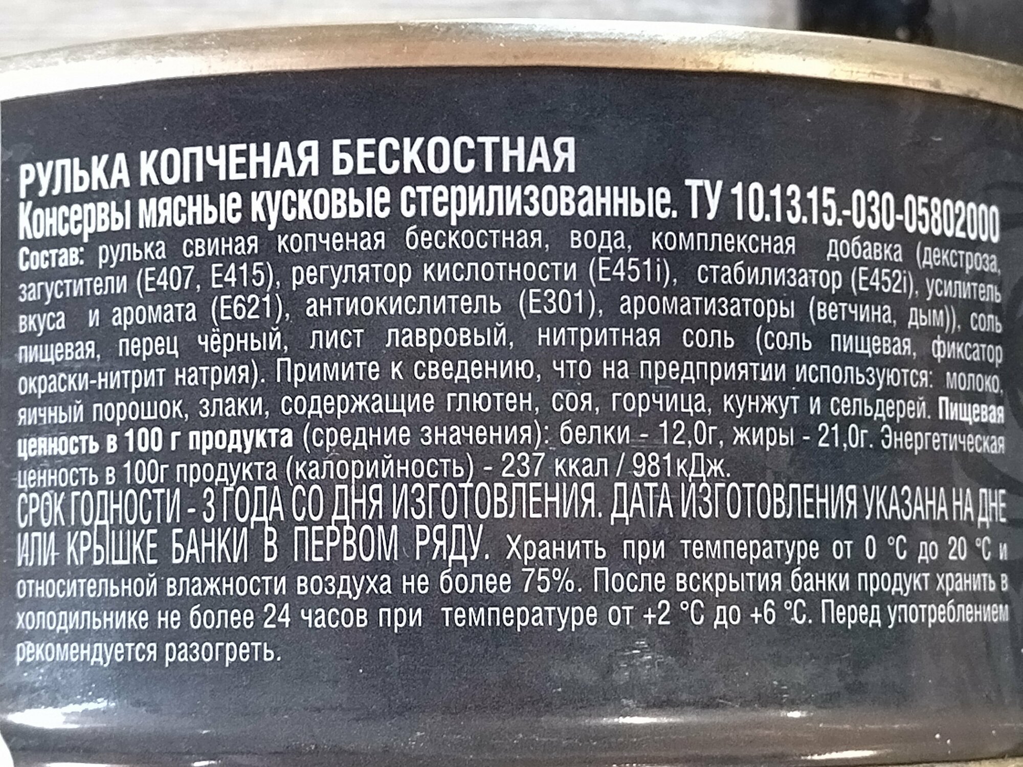 | Состав | рулька свиная копченая бескостная, вода, комплексная добавка (декстроза, загустители (E407, E415), регулятор кислотности (Е451i), стабилизатор (Е452i), усилитель вкуса и аромата (Е621), антиокислитель (Е301), ароматизаторы (ветчина, дым)), соль пищевая, перец черный, лист лавровый, нитритная соль (соль пищевая, фиксатор окраски - нитрит натрия) |