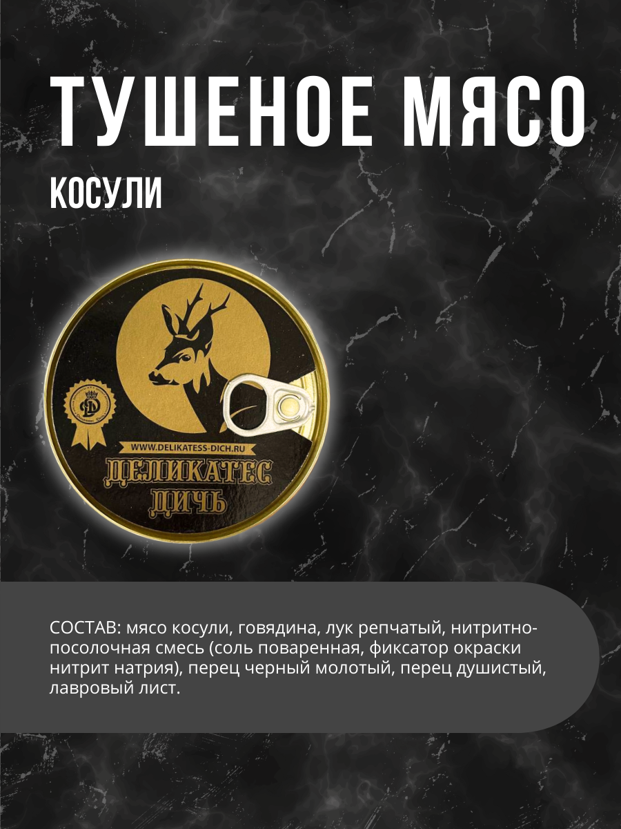 Ниже Вы можете прочитать отзывы на Косуля тушеное мясо 325 грамм, ознакомится с подробными характеристиками, посмотреть интересные обзоры и фотографии на Косуля тушеное мясо 325 грамм.