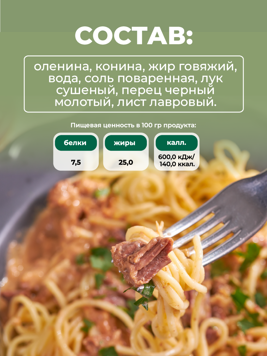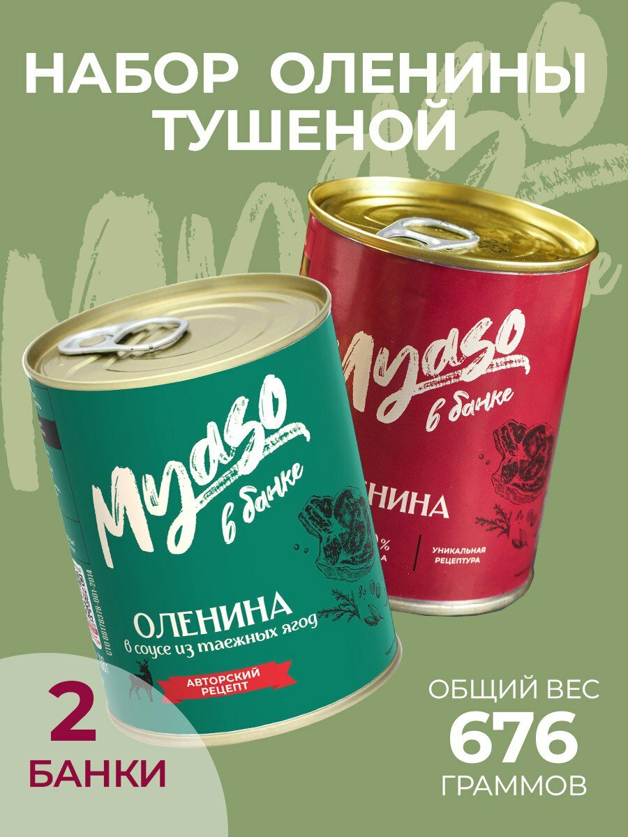 | Состав | Оленина тушеная 338 гр. + Оленина в соусе из таежных ягод 338 гр |