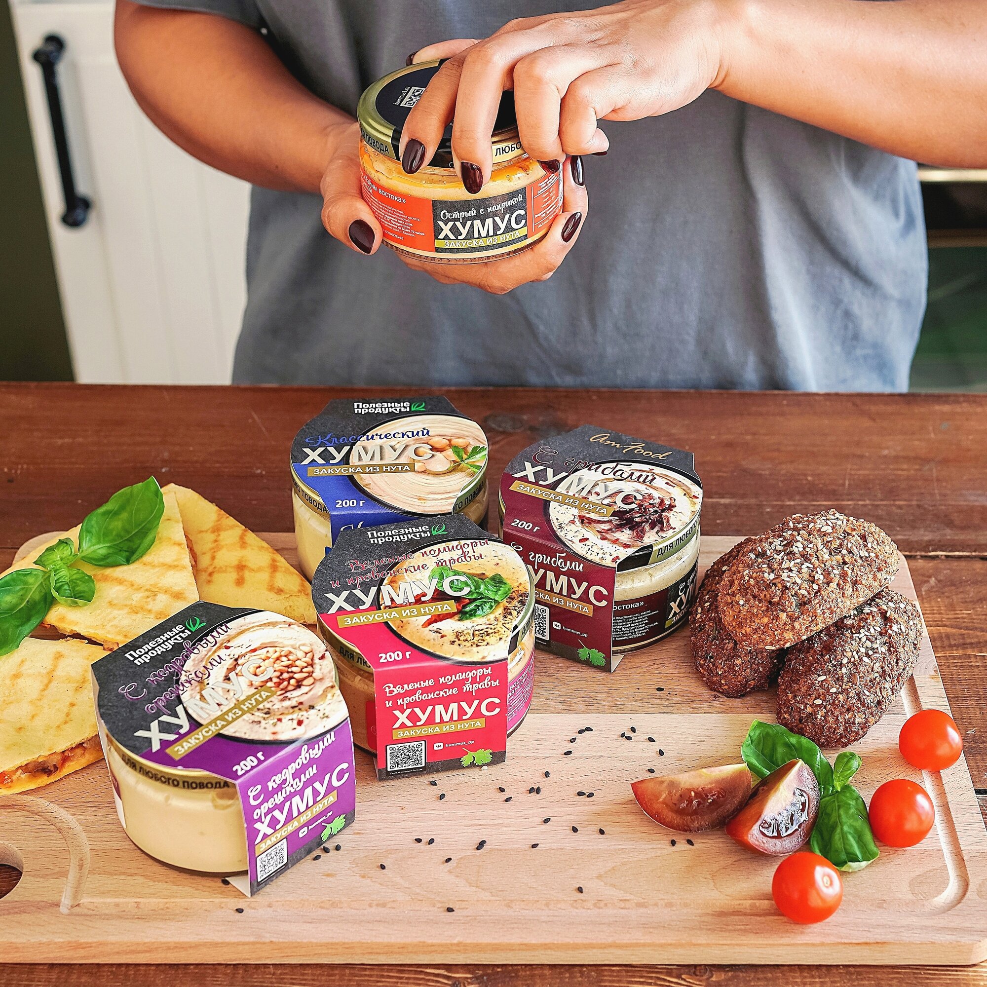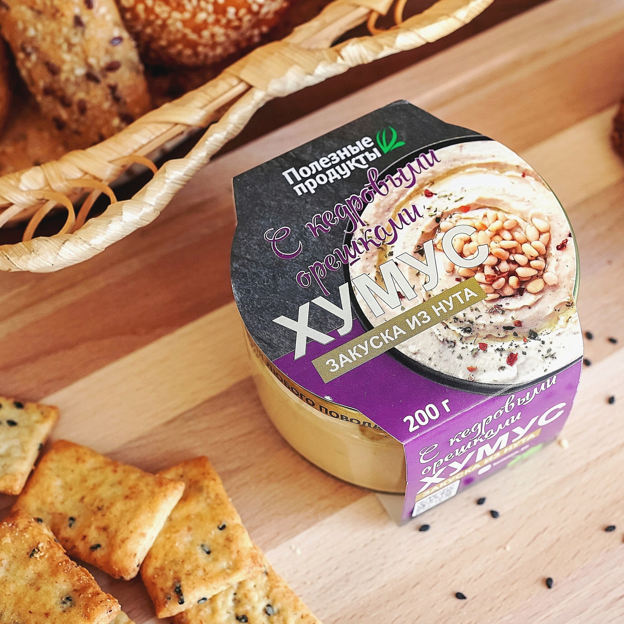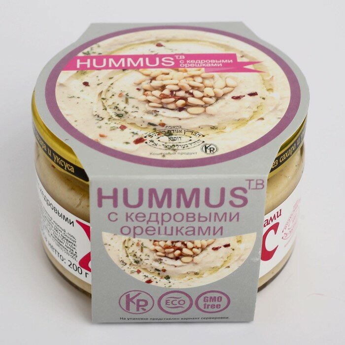 | Состав | нут, вода питьевая, кунжутная паста (тахина), масло подсолнечное, масло оливковое, орех кедровый жареный, соль, чеснок, регулятор кислотности (лимонная кислота), консерванты (сорбат калия, бензоат натрия), паприка, петрушка, перец красный молотый. |