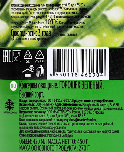 | Состав | горох овощной свежий, сахар белый кристалический, соль пищевая |