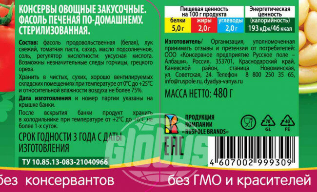 | Состав | фасоль продовольственная (белая), лук свежий, томатная паста, масло подсолнечное, сахар, соль, регулятор кислотности - уксусная кислота ледяная |