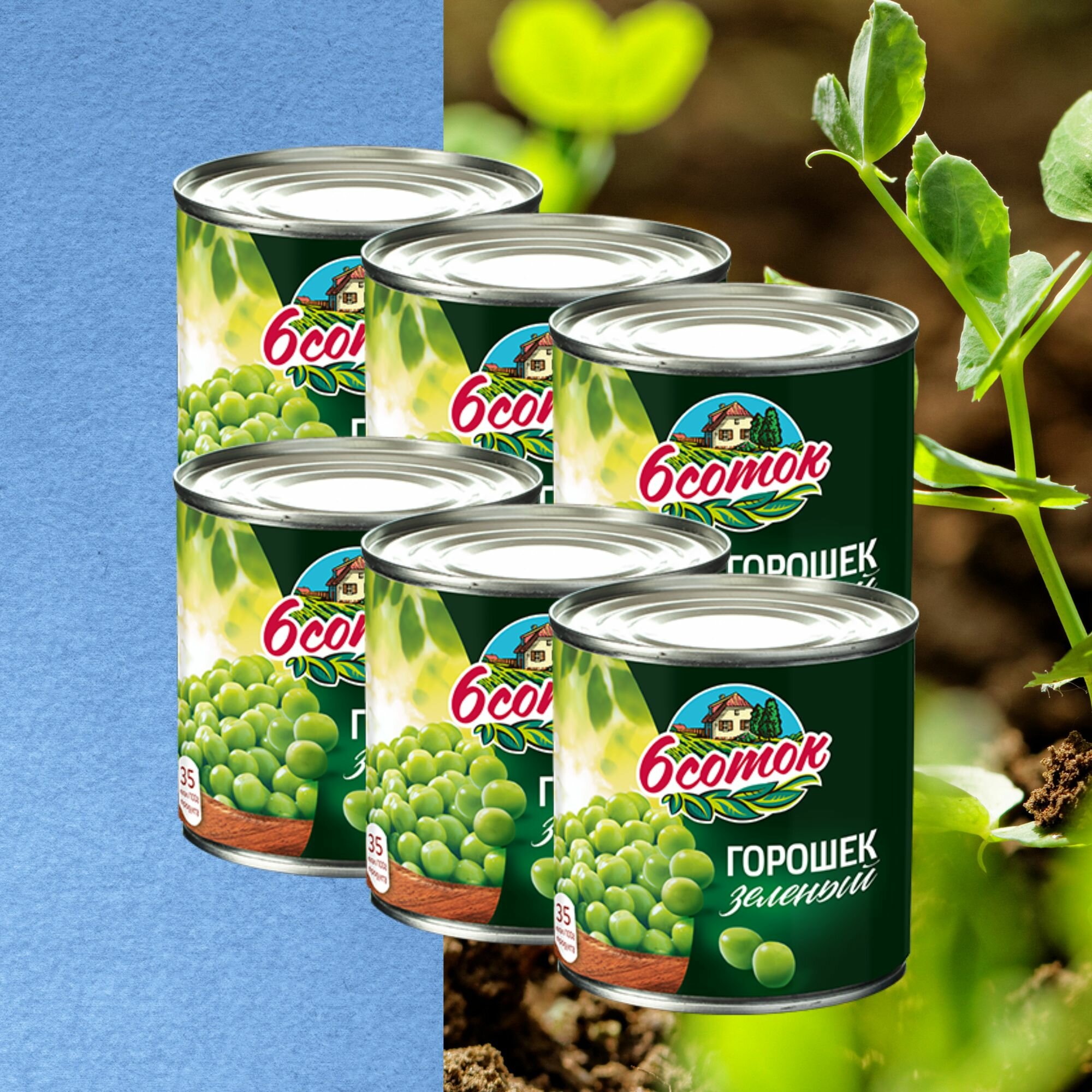 Горошек зелёный консервированный "6 Соток", 6 штук по 425 мл.