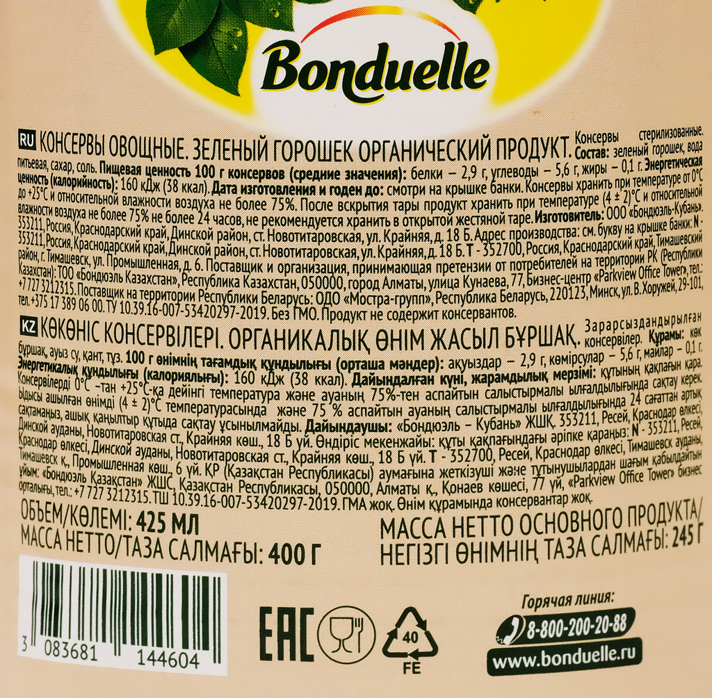Горошек зеленый BONDUELLE Органик, 400г интересное: