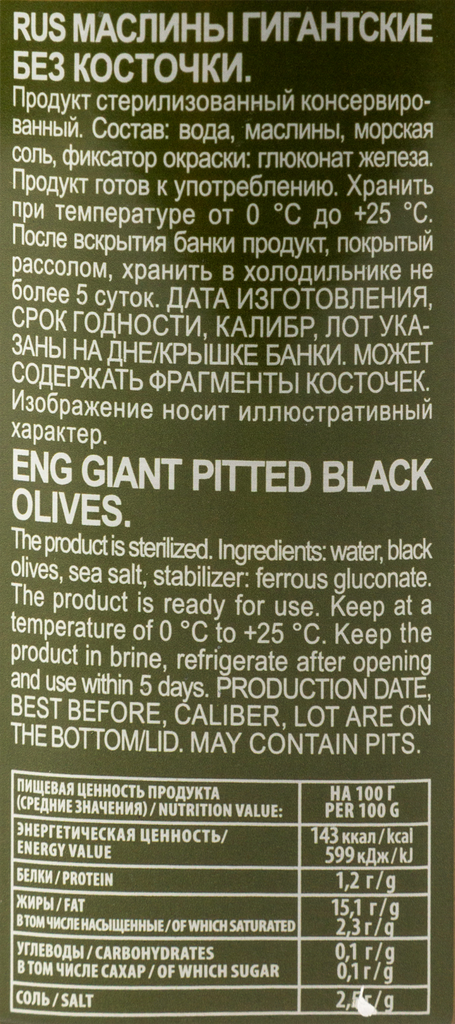 | Состав | вода питьевая, маслины без косточки, соль, фиксатор окраски: глюконат железа |