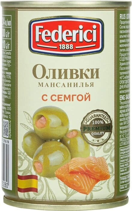 | Состав | вода питьевая, оливки без косточки, паста из семги (вода питьевая, семга, загуститель: альгинат натрия), соль, усилитель вкуса и аромата: глутамат натрия; регуляторы кислотности: молочная кислота, лимонная кислота; антиокислитель: аскорбиновая кислота; ароматизатор |