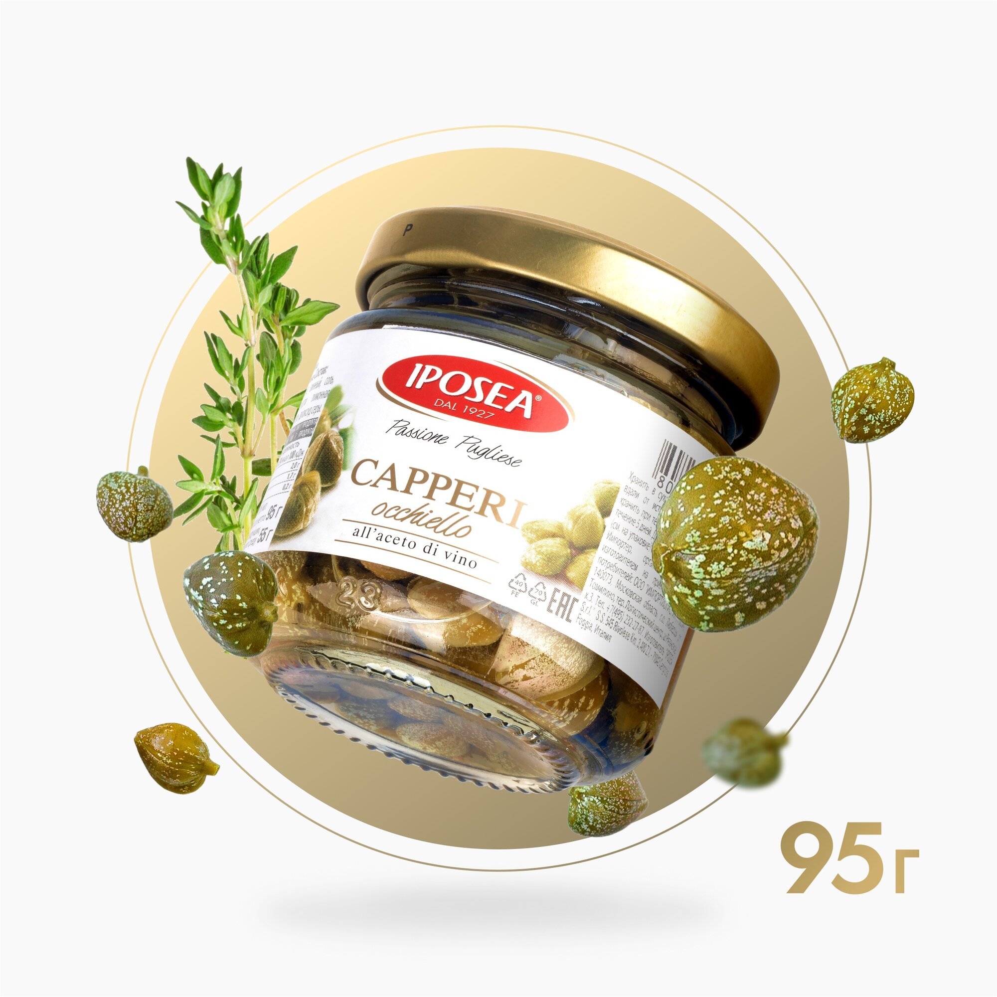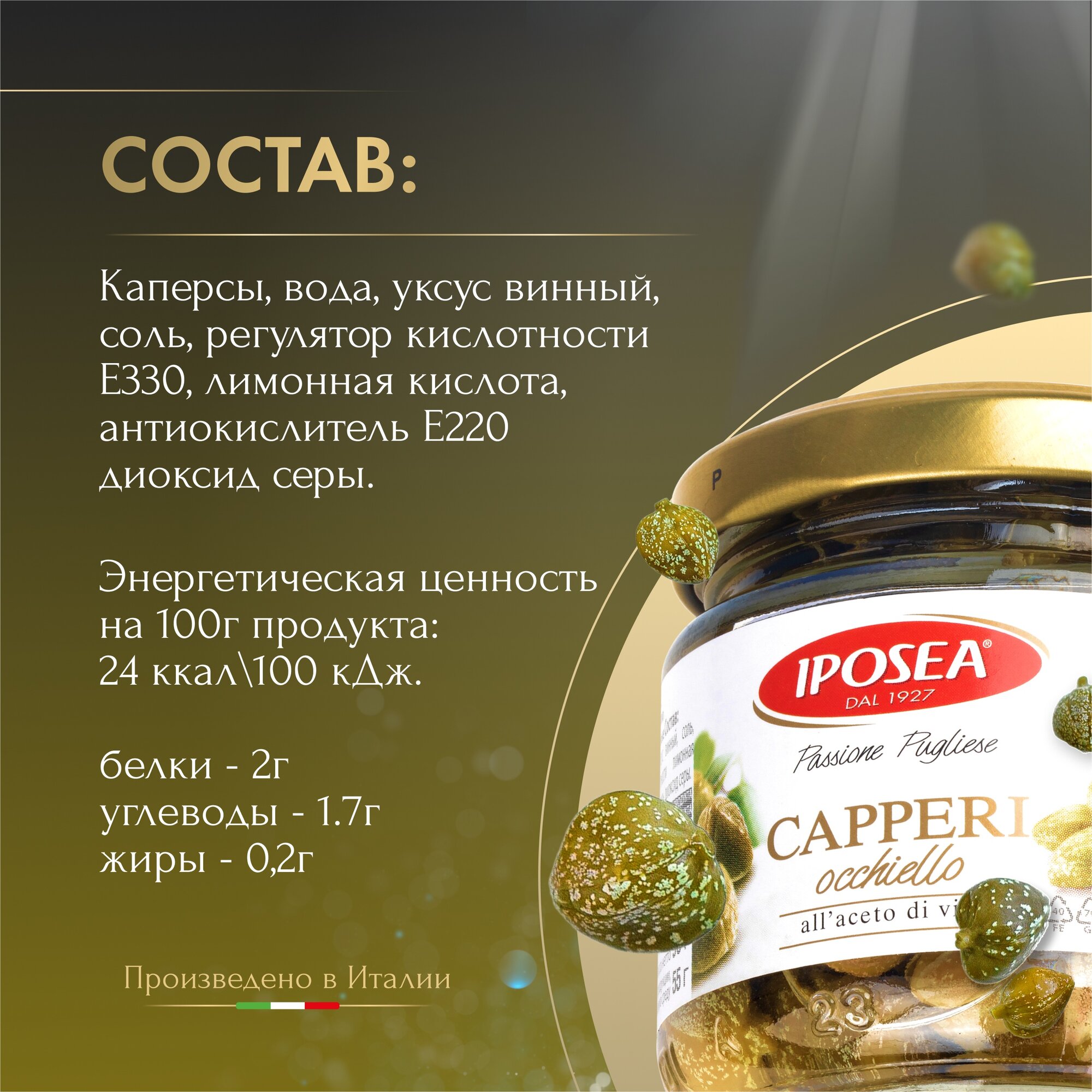 | Состав | каперсы, вода, уксус винный, соль, регулятор кислотности Е330 лимонная кислота, антиокислитель E220 диоксид серы |