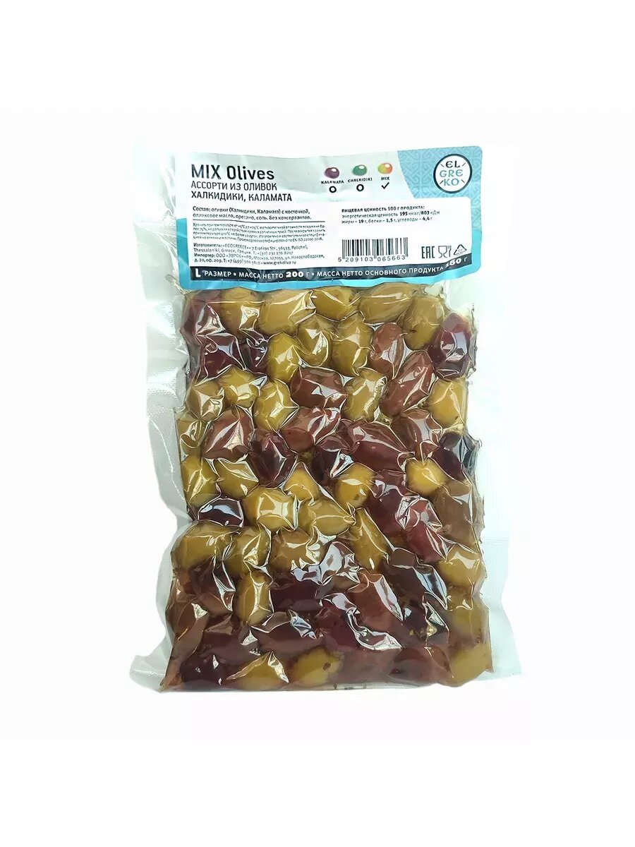 Оливки с косточкой Греческие ассорти Халкидики и Каламата в вакуумной упаковке, MIX Olives El Greko, Греция, 200 грамм