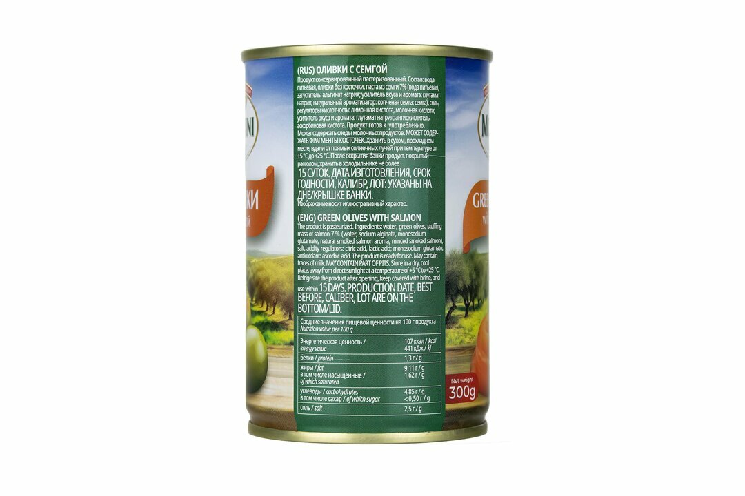 | Состав | вода питьевая, оливки без косточки, паста из семги 7 % (вода питьевая, загуститель: альгинат натрия; усилитель вкуса и аромата: глутамат натрия; натуральный ароматизатор: копченая семга; семга), соль, регуляторы кислотности: лимонная кислота, молочная кислота; усилитель вкуса и аромата: глутамат натрия; антиокислитель: аскорбиновая кислота. |