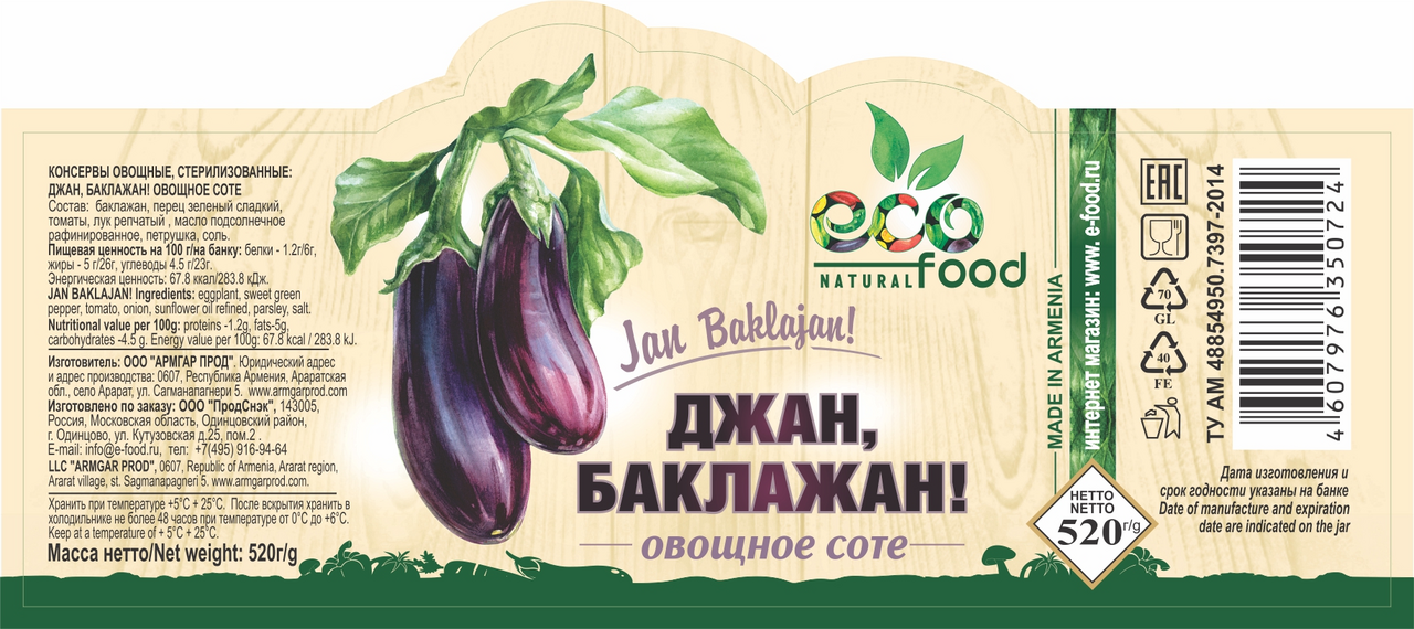 Джан, Баклажан! Овощное соте, 520 г х 6 шт ECOFOOD (Армения)