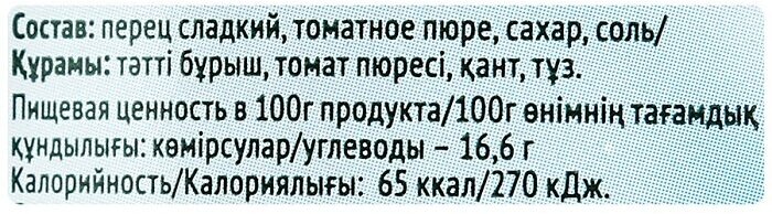 | Состав | перец сладкий 40%, томатная паста, вода, сахар, соль, регулятор кислотности: лимонная кислота |