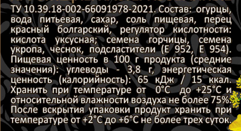 | Состав | огурцы, вода питьевая, сахар, соль пищевая, перец красный болгарский, регулятор кислотности уксусная кислота, семена укропа, семена горчицы, чеснок, подсластители (Е952, Е954) |