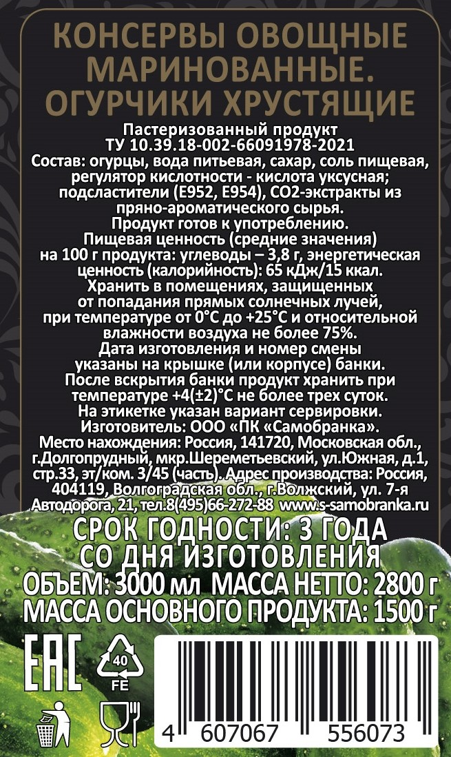 | Состав | Огурцы, вода, сахар, соль, регулятор кислотности (кислота уксусная), подсластители, экстракты из пряно-ароматического сырья. |