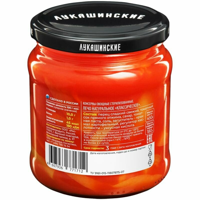 Лечо классическое натуральное лукашинские, 450 г, 470 мл