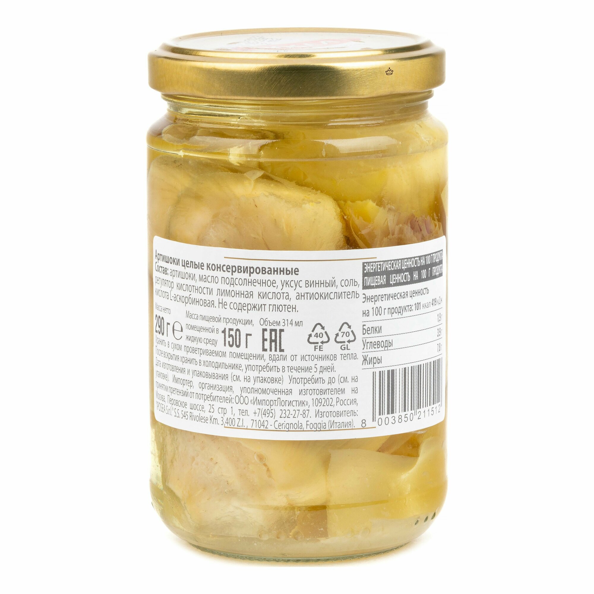 | Состав | артишоки, масло подсолнечное, уксус винный, соль, регулятор кислотности, лимонная кислота, антиокислитель |