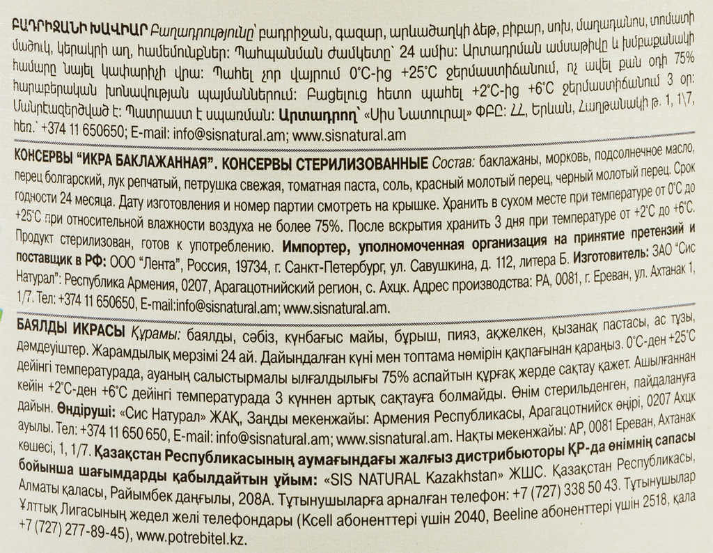 | Состав | баклажаны, морковь, подсолнечное масло, перец сладкий, лук репчатый, петрушка свежая, томатная паста, пищевая соль, красный молотый перец, черный молотый перец. |