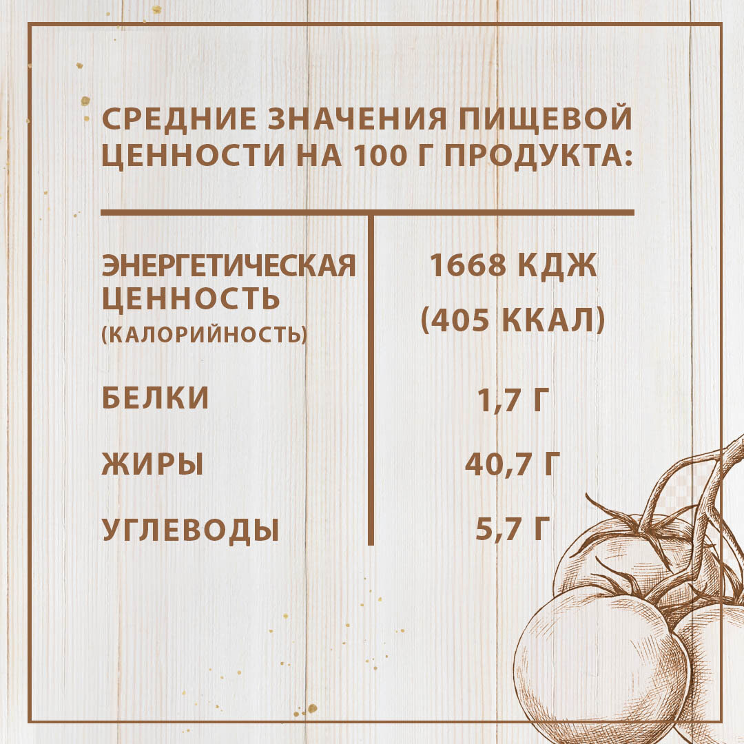 | Состав | Сушеные томаты 58%, подсолнечное масло, винный уксус, соль, орегано, антиокислители: аскорбиновая кислота, диоксид серы; регуляторы кислотности: лимонная кислота, молочная кислота. |