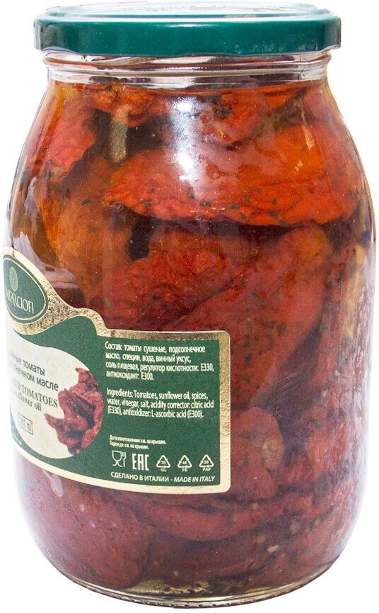 | Состав | Томаты сушеные, подсолнечное масло, специи, вода, винный уксус, соль пищевая, регулятор кислотности Е330, антиоксидант: Е300. |