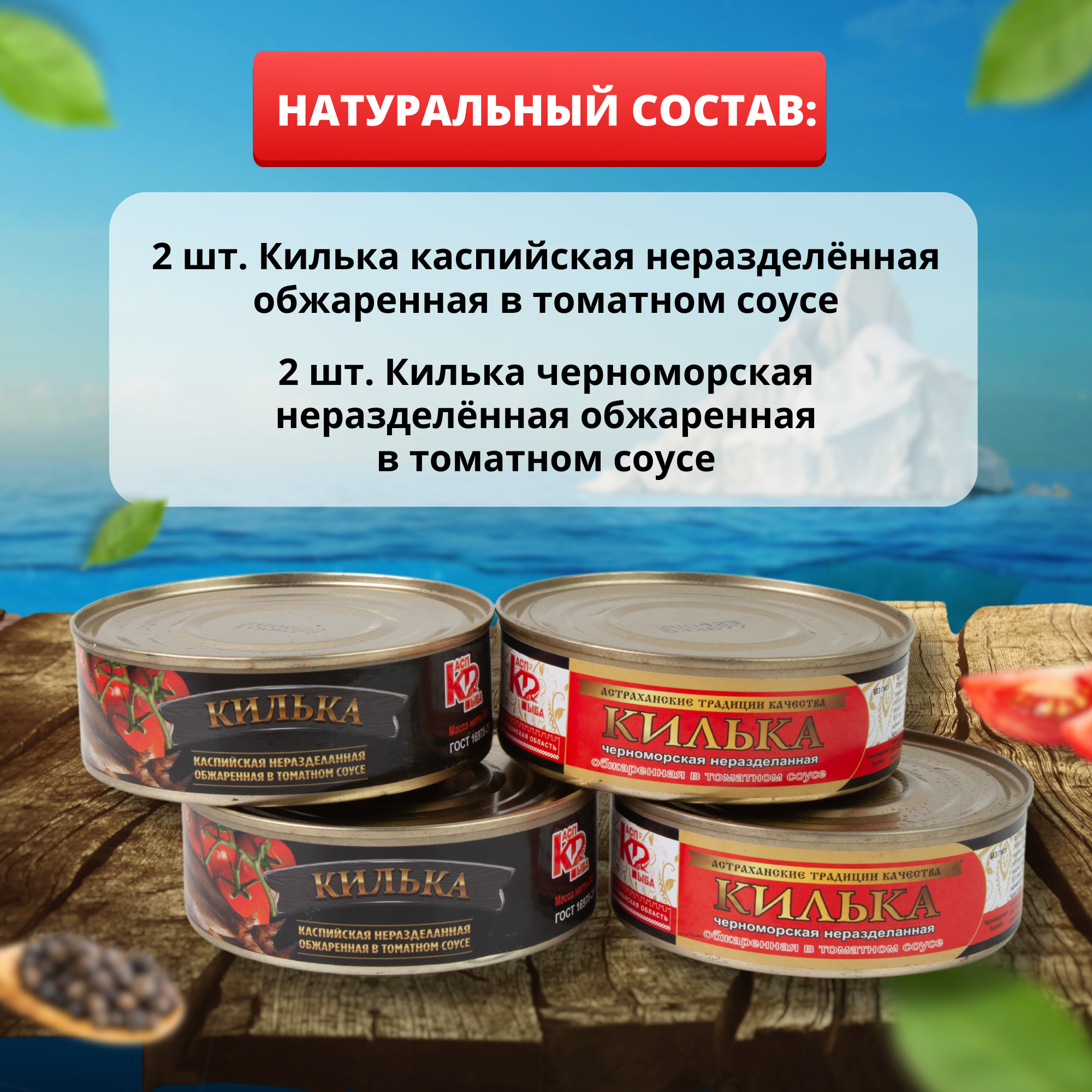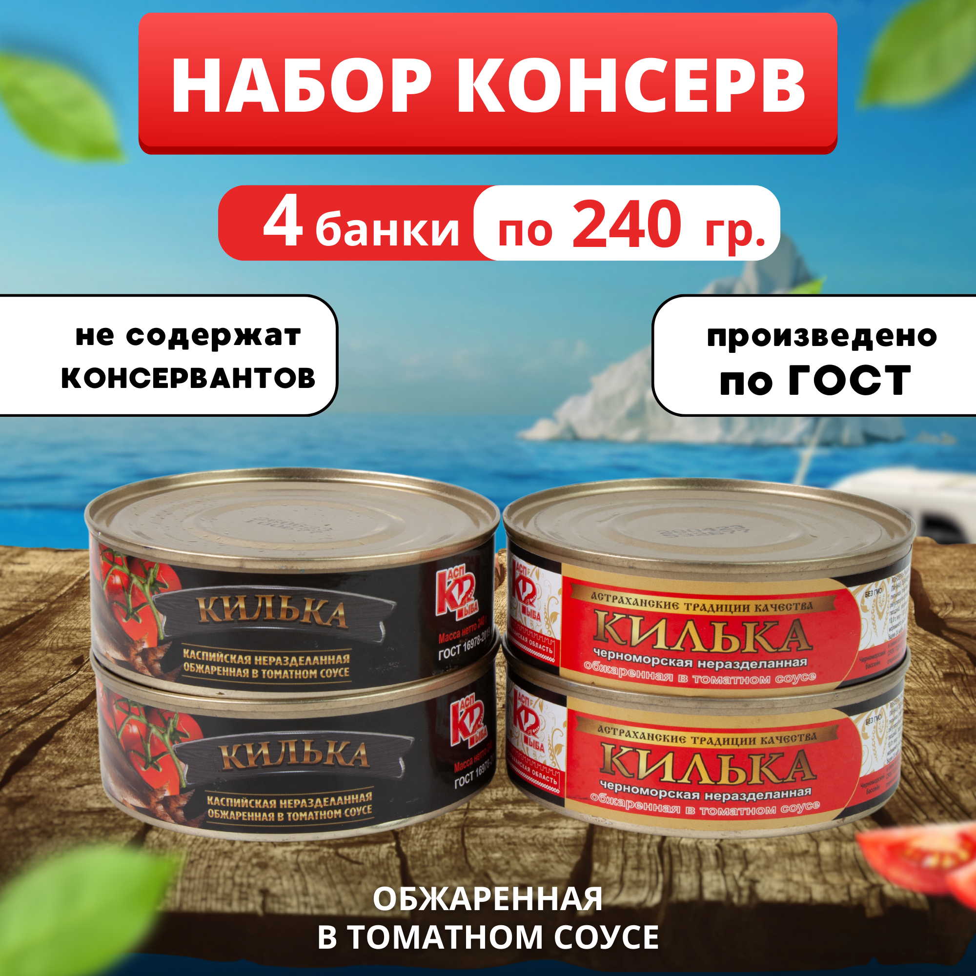 | Состав | Состав набора: "Килька черноморская обжаренная в томатном соусе" (240гр) - 2 шт.; "Килька каспийская неразделанная обжаренная в томатном соусе" (240 гр) - 2 шт. |