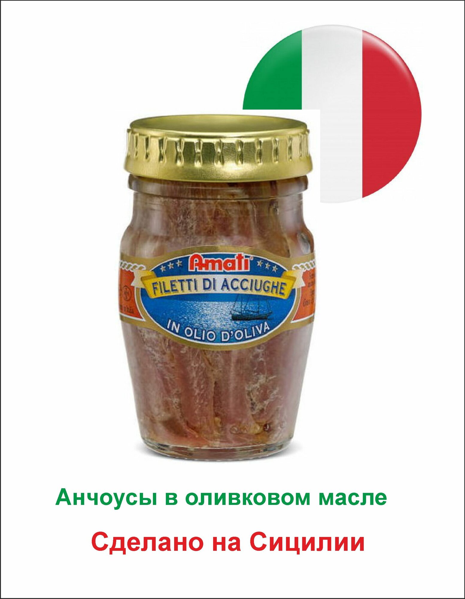 Филе анчоусов Amati в оливковом масле, 80 г. Сделано в Италии (Сицилия). интересное:
