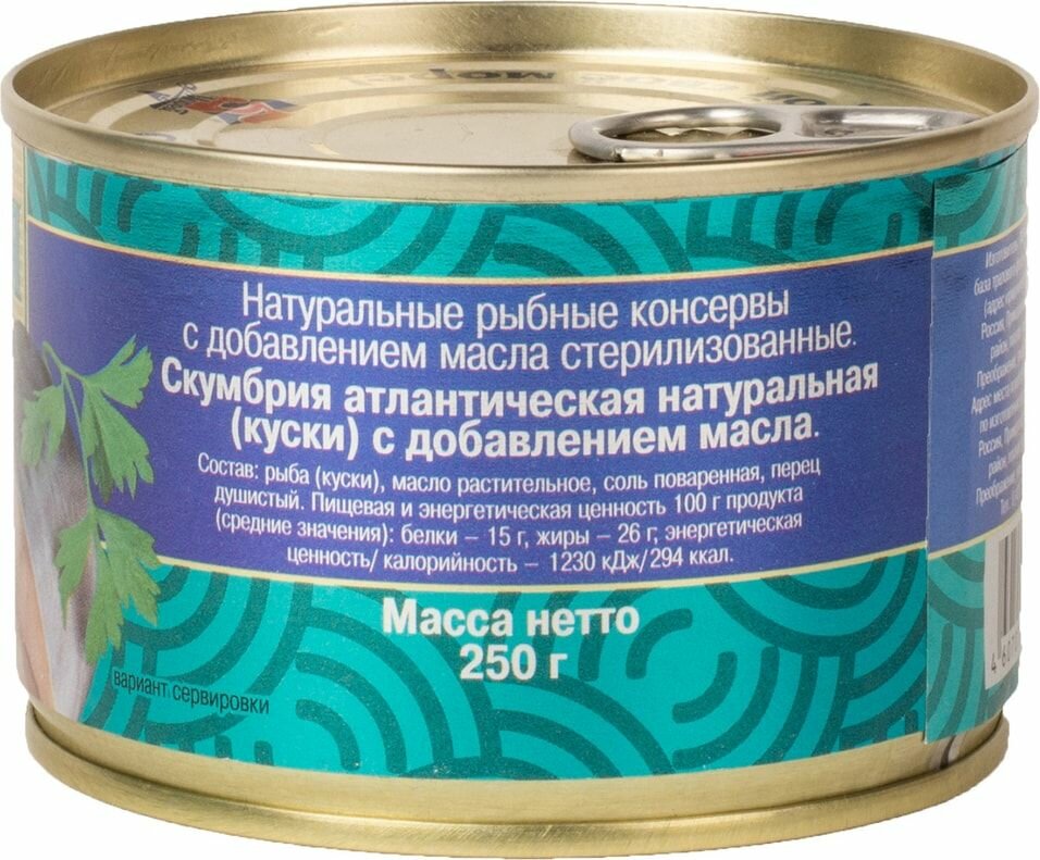 | Состав | скумбрия атлантическая (куски), масло растительное, соль, перец душистый горошек |