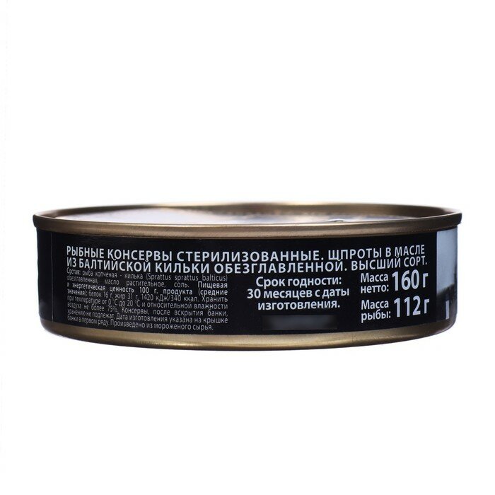 | Состав | килька балтийская (шпрот балтийский) горячего копчения, масло подсолнечное рафинированное, соль пищевая |
