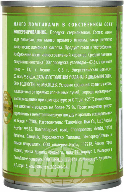 | Состав | манго, вода питьевая, сок манго прямого отжима, сахар, регулятор кислотности: лимонная кислота |