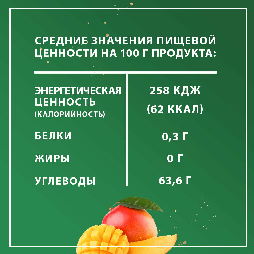 | Состав | манго, вода питьевая, сок манго прямого отжима, сахар, регулятор кислотности: лимонная кислота |