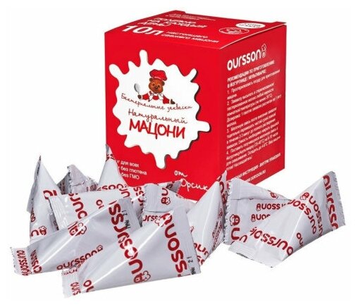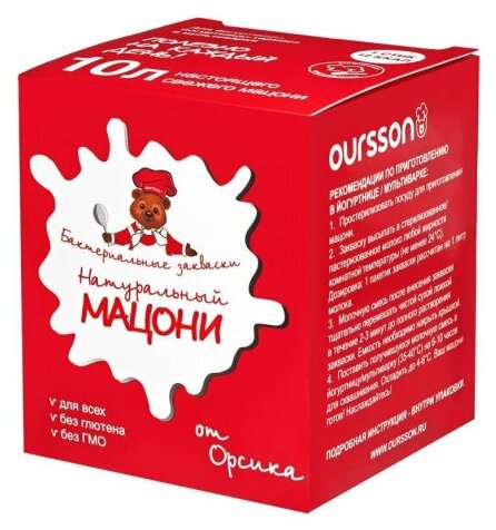 | Способ приготовления | простерилизовать посуду для приготовления ряженки; закваску высыпать в стерилизованное/пастеризованное топленое молоко любой жирности комнатной температуры (22-24°С); дозировка: 1 пакетик закваски рассчитан на 1 литр молока; молочную смесь после внесения закваски тщательно перемешать чистой сухой ложкой в течение 2-3 минут до полного растворения закваски, емкость необходимо накрыть крышкой; поставить получившуюся молочную смесь в прибор для ферментации OURSSON (35-40°С) на 6-10 часов для сквашивания, охладить до 4-6°С |