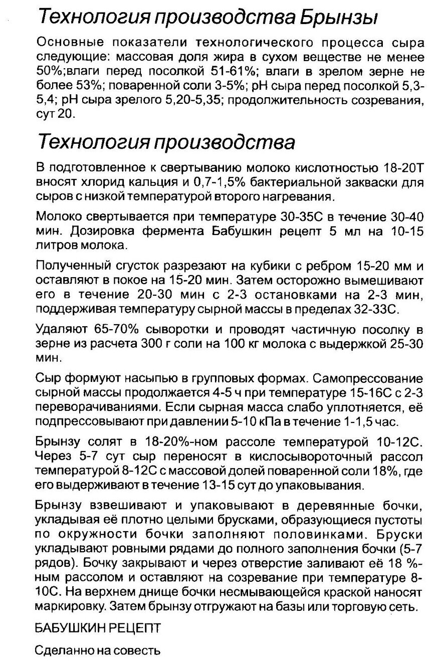 | Способ приготовления | Рецепт от производителя: растворите 5 мл раствора фермента из флакона в 10 л молока; нагрейте свежее домашнее не кипяченое молоко с ферментом(коровье,овечье или козье) до температуры 35 градусов; дайте настояться около 20 минут; процедите через марлю; придайте форму |