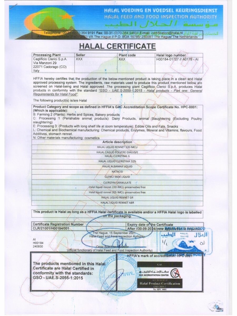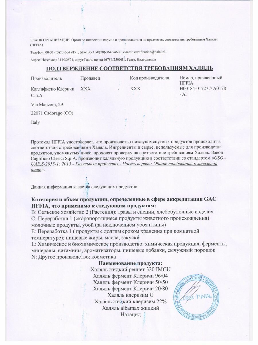 | Способ приготовления | Раствор фермента готовится непосредственно перед внесением в молоко. Рекомендуемая доза для производства твердых сыров 0,45 – 0,6 грамм на 100 килограмм перерабатываемого молока. Фермент вноситься в молоко после добавления в нее всех необходимых компонентов (при температуре сквашивания(+32…+36°С), в зависимости от вида сыра, нужного времени сворачивания и сезона года), следующим образом: отмеренное количество растворяется в 10-кратном (относительно объема фермента) объеме холодной, питьевой воды и добавляют полученный раствор в молоко для выработки сыра, при тщательном перемешивании в течении 5 минут. Количество фермента определяют с учетом того, что молоко должно в течении 25-45 минут дать плотный, равномерный по всей массе, сгусток, готовый к разрезке. |