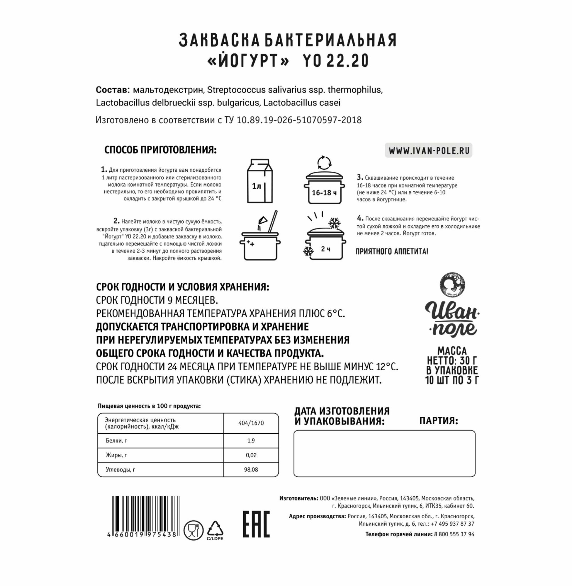 Набор закваска Йогурт и Айран, 20 порций, сухая бактериальная, Иван-поле