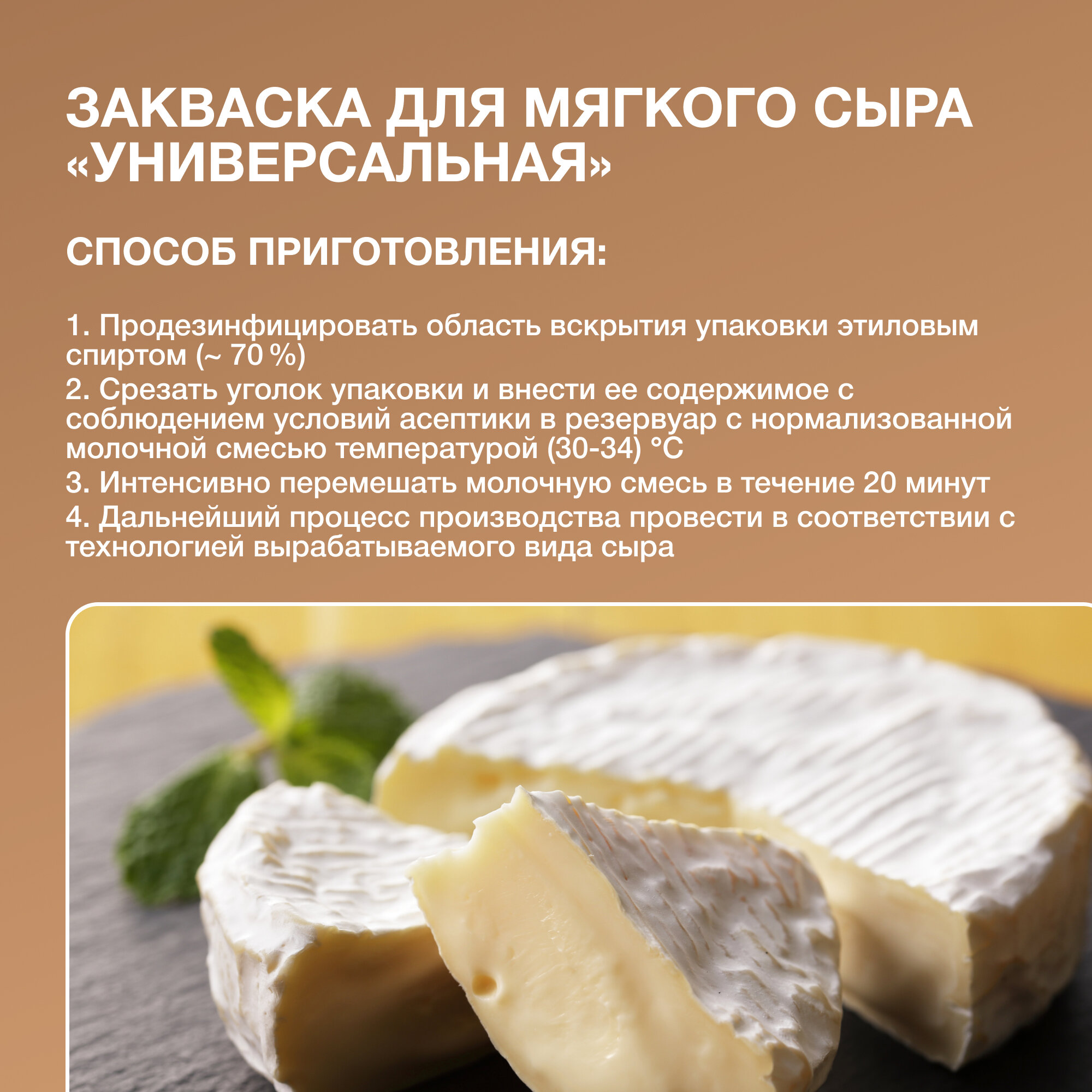 | Способ приготовления | Закваска для мягкого сыра 1) Продезинфицировать область вскрытия упаковки этиловым спиртом (прибл. 70%). 2) Срезать уголок упаковки и внести ее содержимое с соблюдением условий асептики в резервуар с нормализованным молоком рекомендуемой температурой 30-34 °С. 3) Интенсивно перемешать молочную смесь в течение 20 минут. 4) Дальнейший процесс производства провести в соответствии с технологией вырабатываемого вида сыра. |
