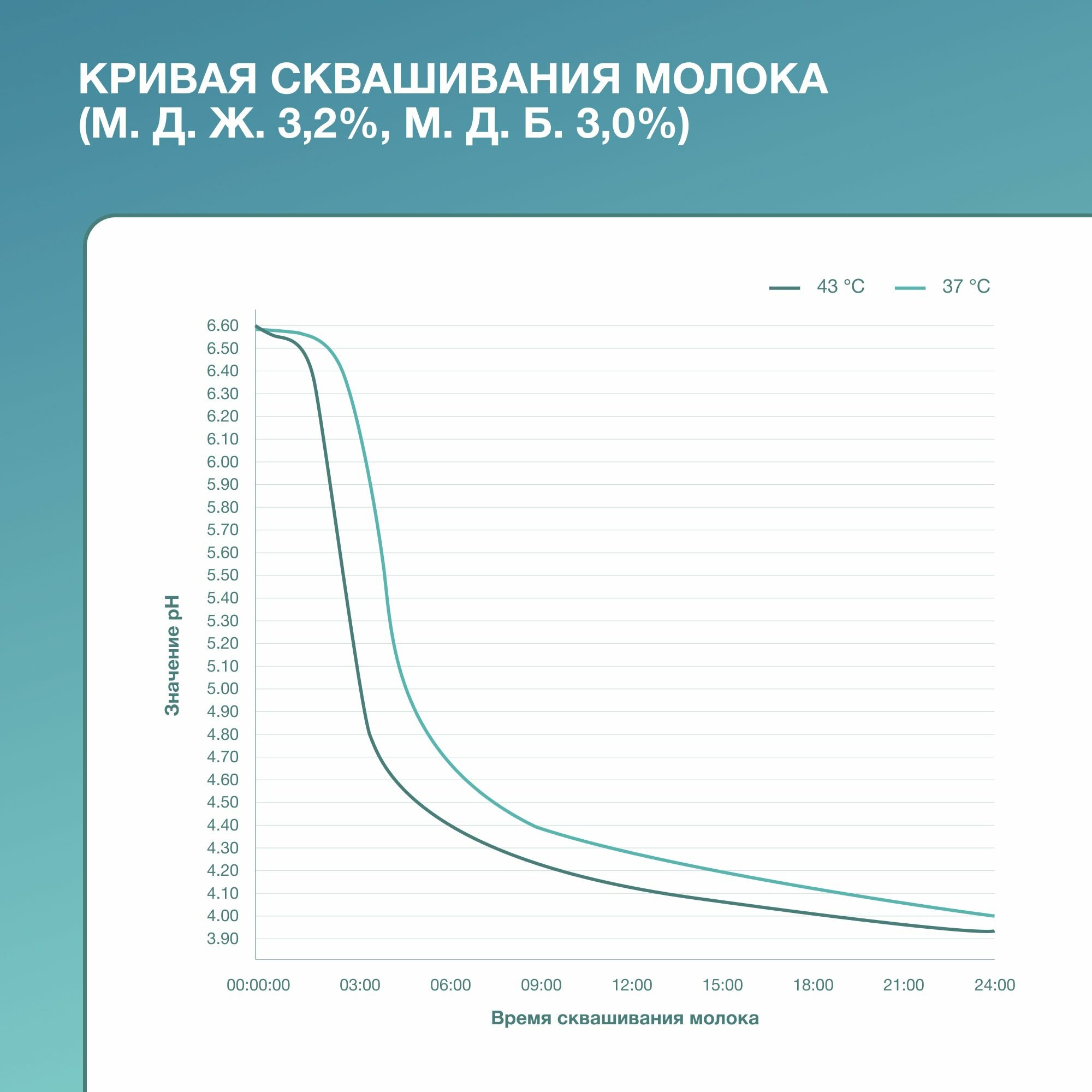 | Способ приготовления | Закваска для приготовления низколактозного йогурта. 1) Продезинфицировать область вскрытия упаковки этиловым спиртом пищевым (прибл. 70%). 2) Срезать уголок упаковки и внести ее содержимое с соблюдением условий асептики в резервуар с нормализованным молоком рекомендуемой температурой 37-43 °С. 3) Интенсивно перемешать молочную смесь в течение 20 минут. При термостатном способе производства перемешивание необходимо продлить до 30 минут. 4) Продолжительность сквашивания молока с момента внесения закваски : при 37-39°С составляет 8-9 ч; при 40-41°С составляет 7-8 ч; при 42-43°С составляет 6-7 ч. |