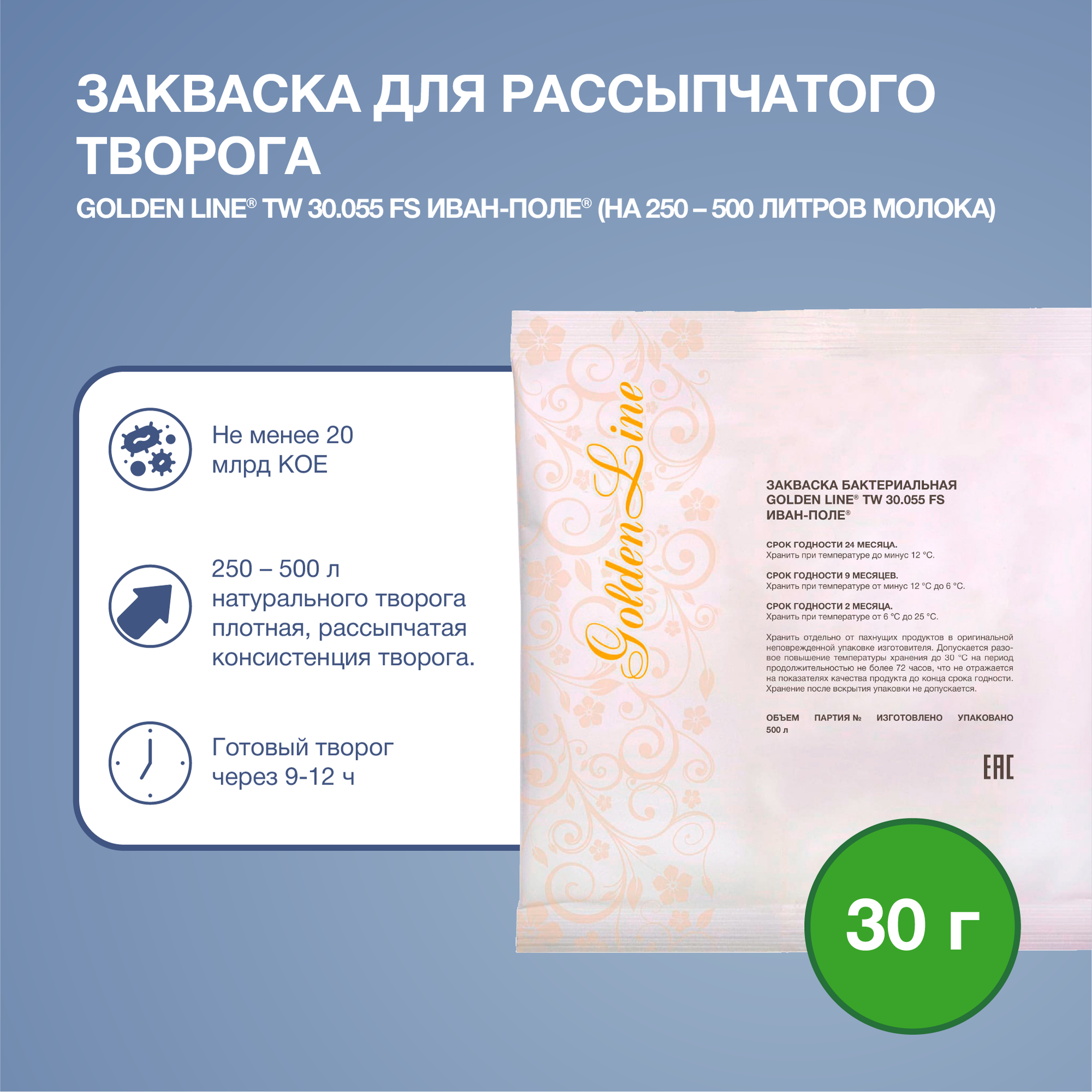 Закваска для Творога Рассыпчатого Golden Line, 30 г на 250 - 500 л молока, сухая бактериальная, Иван-поле интересное: