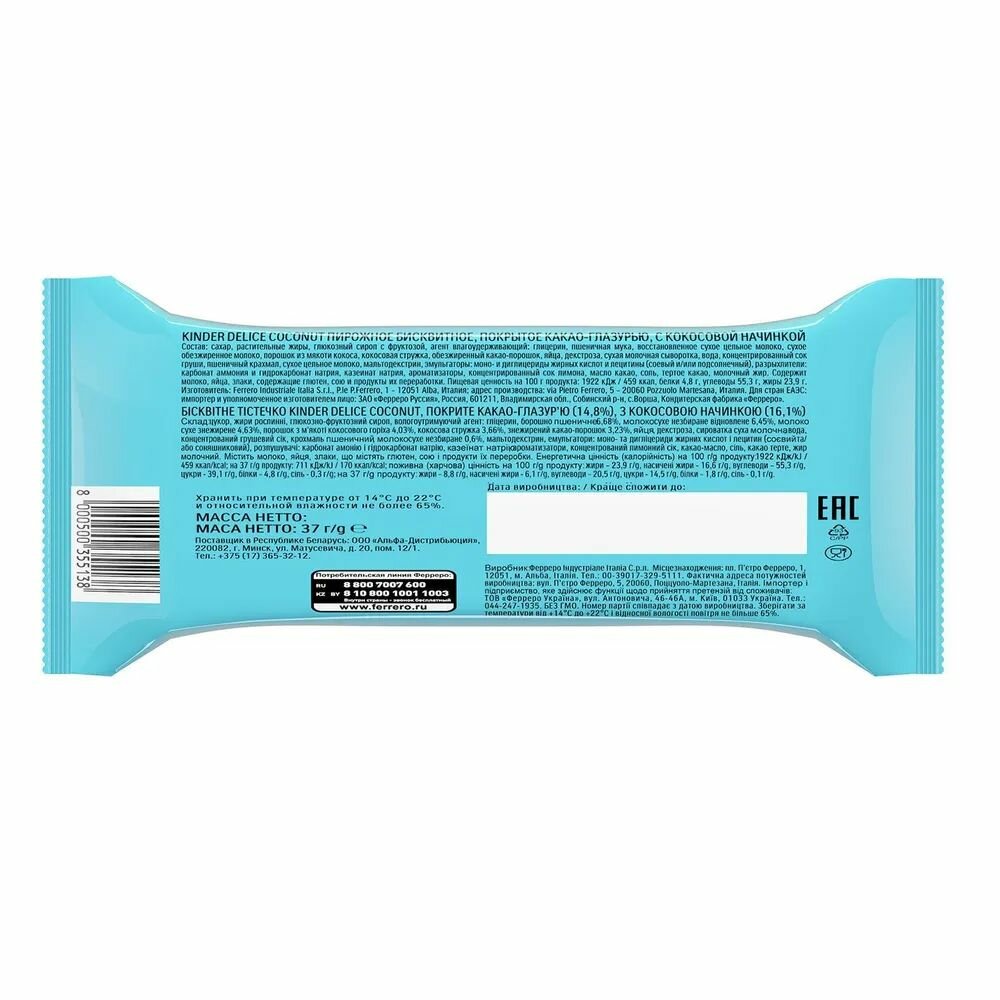 Купить Пирожное Kinder Delice, бисквитное, покрытое какао-глазурью, с кокосовой начинкой, 20 шт по 37 г