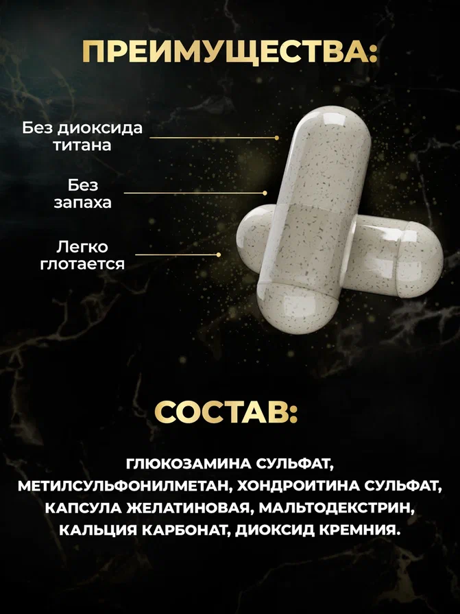 | Дополнительная информация | ДжиСиЭм ДЖОИНТ - это сбалансированное содержание 4-х компонентной матрицы важнейших элементов(Глюкозамина сульфат, Хондратина сульфат, Метилсульфонилметан (МСМ), Кальция карбонат ), которое укрепляет связки, хрящевую ткань, способствует подвижности и укрепляет суставно-связочный аппарат, способствует восстановлению элементов опорно-двигательного аппарата после различных травм, укрепляет суставно-связочный аппарат. Разработанный продукт отлично подходит для предупреждения любых негативных преобразований в связках и суставах, в том числе, развитие и профилактика остеоартрита. глюкозамина сульфат, хондроитина сульфат, метилсульфонилметан, краситель е171, кальция карбонат, кремния диоксид, желатин |