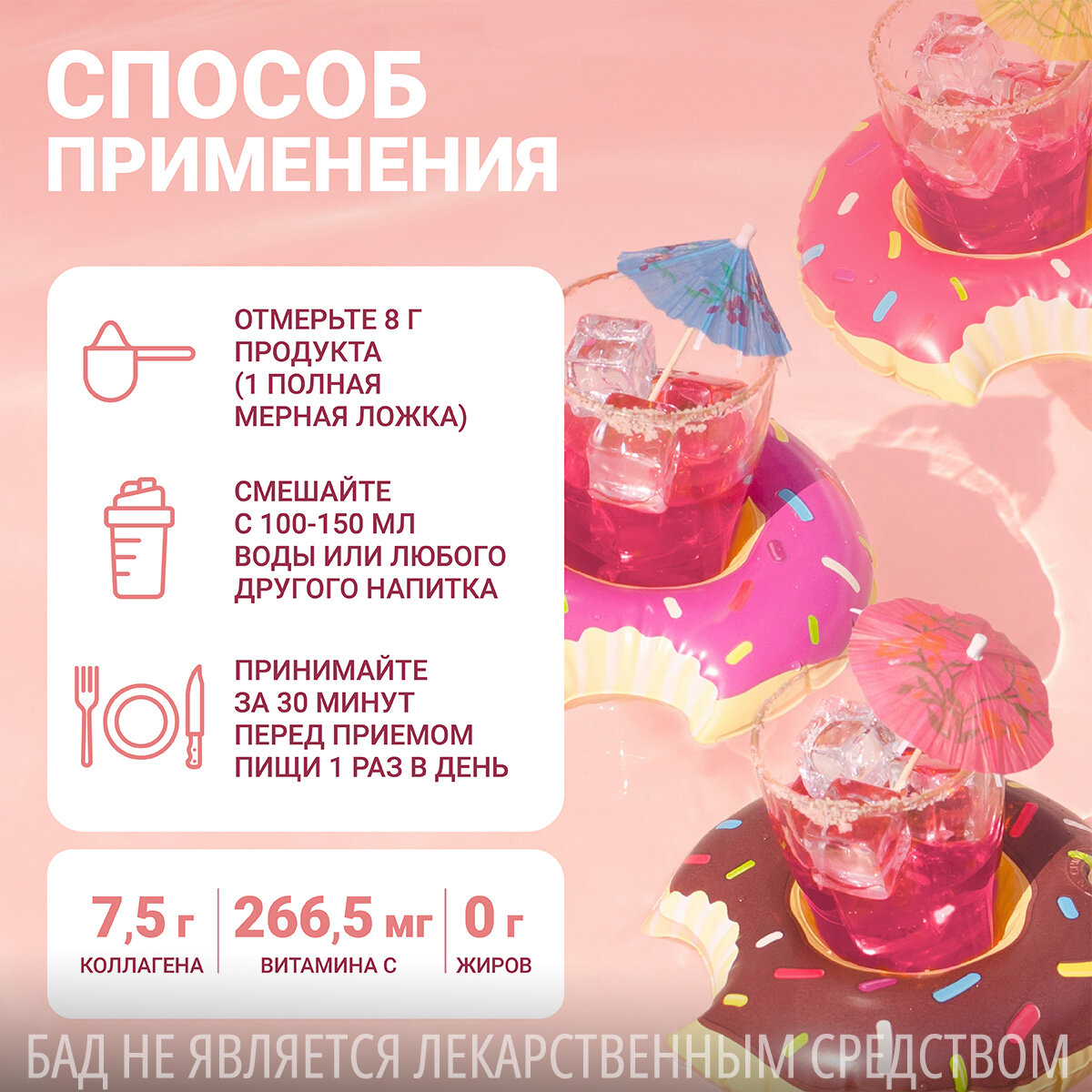| Дополнительная информация | Состав: гидролизованный говяжий коллаген, L-аскорбиновая кислота, ароматизаторы, гиалуроновая кислота, витаминный премикс (L-аскорбиновая кислота, DL-α-токоферола ацетат, ниацин, кальция пантотенат, пиридоксина гидрохлорид, тиамина гидрохлорид, рибофлавин, фолиевая кислота, биотин, цианокобаламин), сукралоза (подсластитель), коэнзим Q10 (убихинон). |