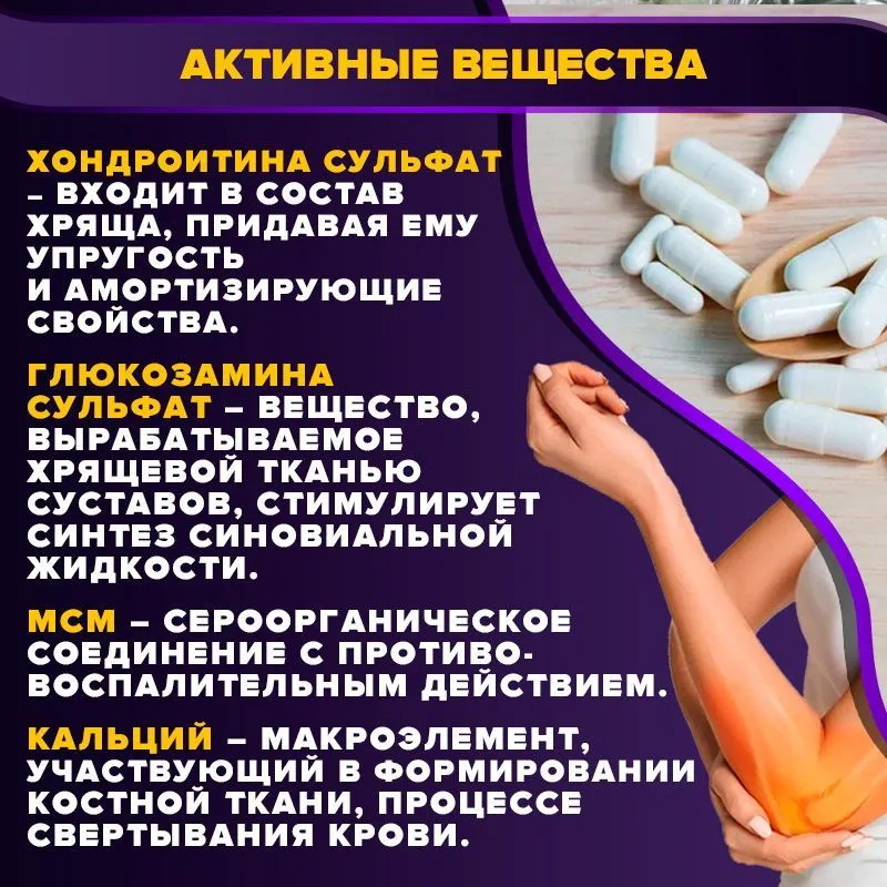 | Дополнительная информация | состав: хондроитина сульфат, глюкозамина сульфат, метилсульфонилметан, кальция глюконат, гидроксипропилметилцеллюлоза, натрия кроскармеллоза, поливиниловый спирт, диоксид кремния, стеарат магния |