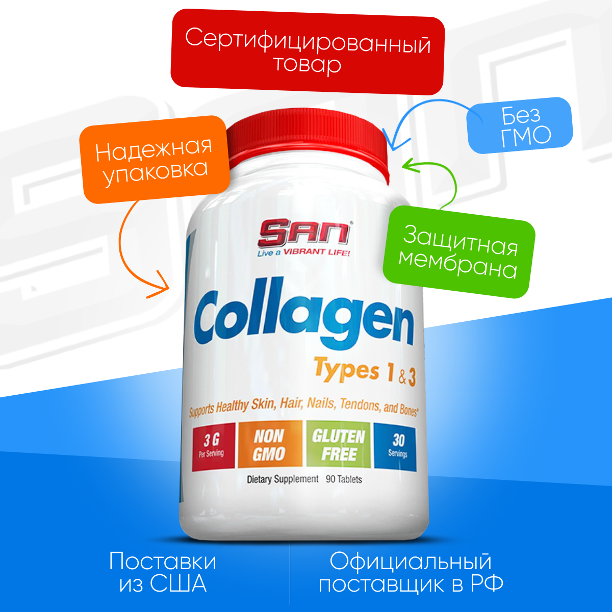 | Дополнительная информация | SAN Collagen Types 1 & 3, обеспечивает чистый, без гормонов и ГМО гидролизованный коллаген, для быстрого усвоения и полного поглощения в кратчайшие сроки. |
