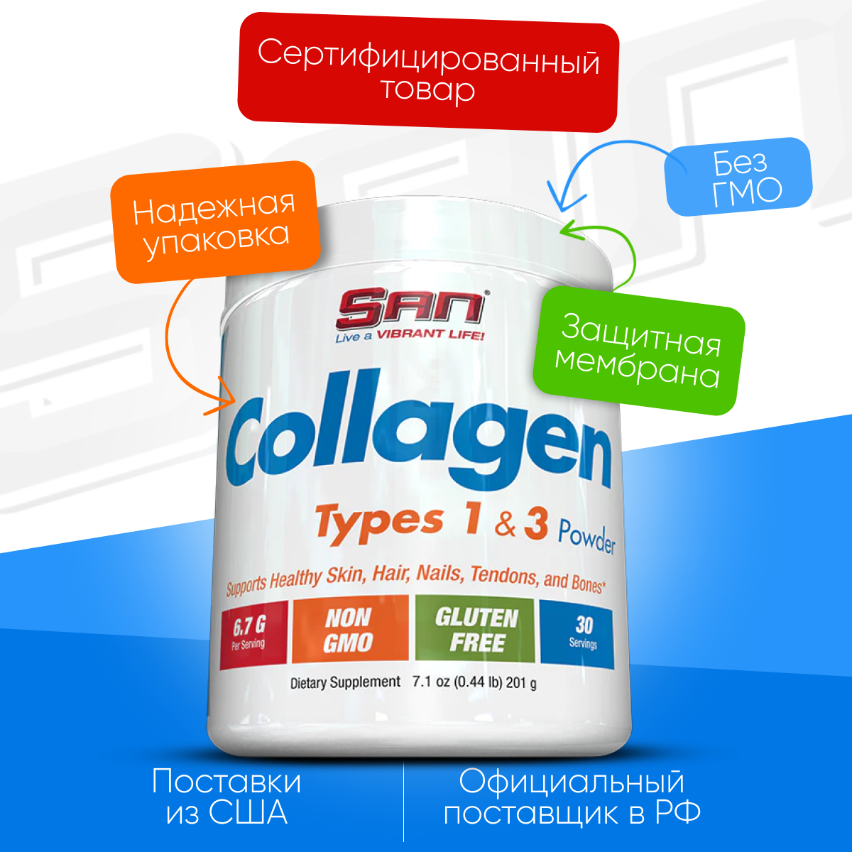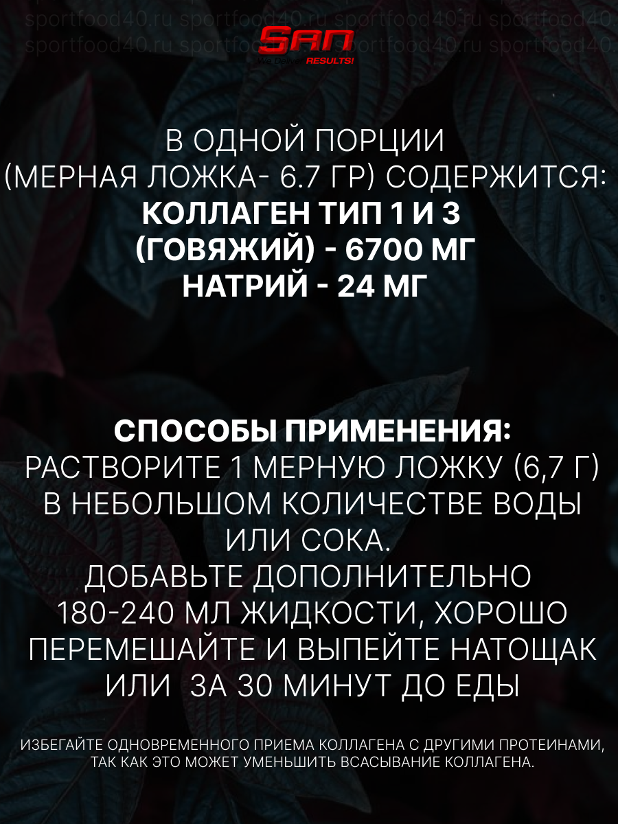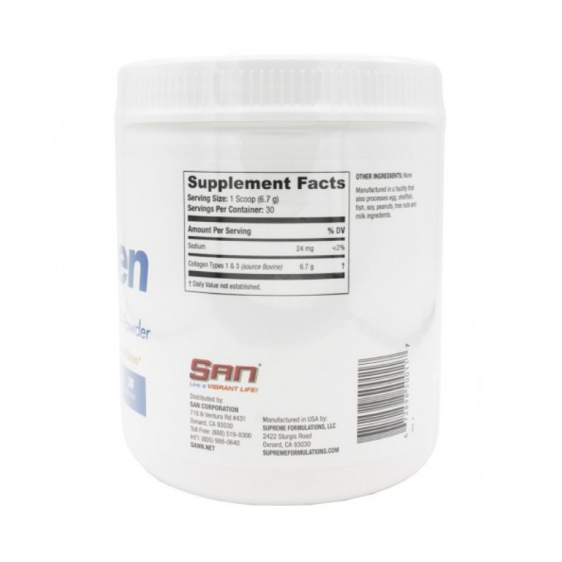 | Дополнительная информация | SAN Collagen Types 1 & 3, обеспечивает чистый, без гормонов и ГМО гидролизованный коллаген, для быстрого усвоения и полного поглощения в кратчайшие сроки. |